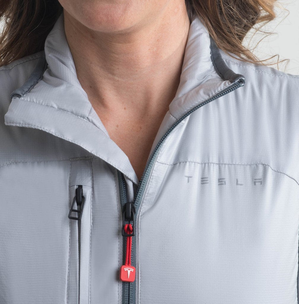 Tesla’s lightweight, polyester insulated vest is built for warmth and versatile enough to be worn with one or several layers. The body is 100% nylon ripstop, with side panels made from soft fleece fabric for extra comfort. Custom logo ‘T’ zipper puller. Reflective Tesla wordmark on the front, and reflective ‘T’ on back left side hem. Right chest zip pocket. Invisible hand warmer pockets.